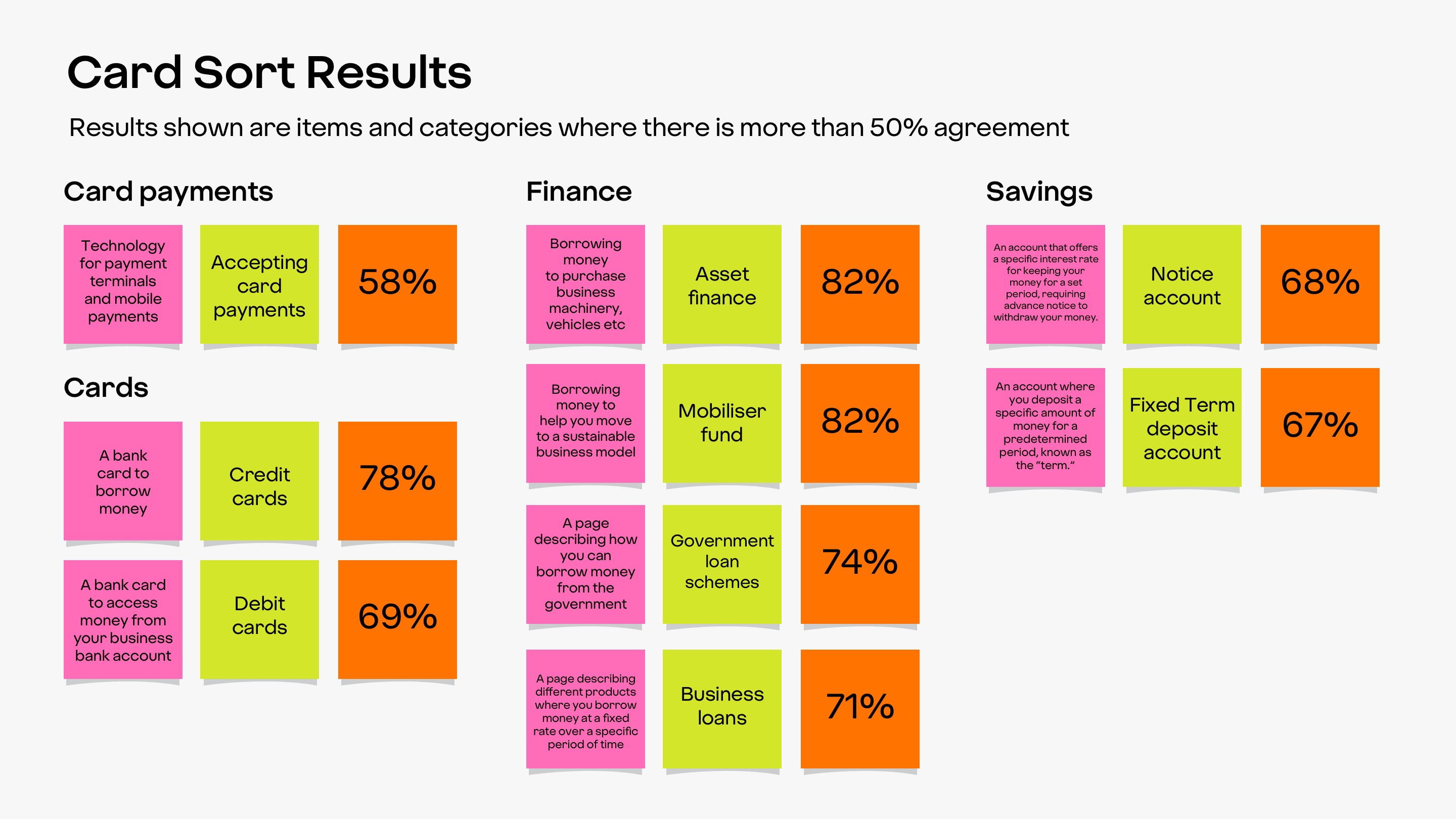 First, I worked with a content designer from the business banking squad to define each item. Then I ran a moderated test where users labelled these definitions to ensure clarity. After cleaning up the definitions, I set up the card sorting.